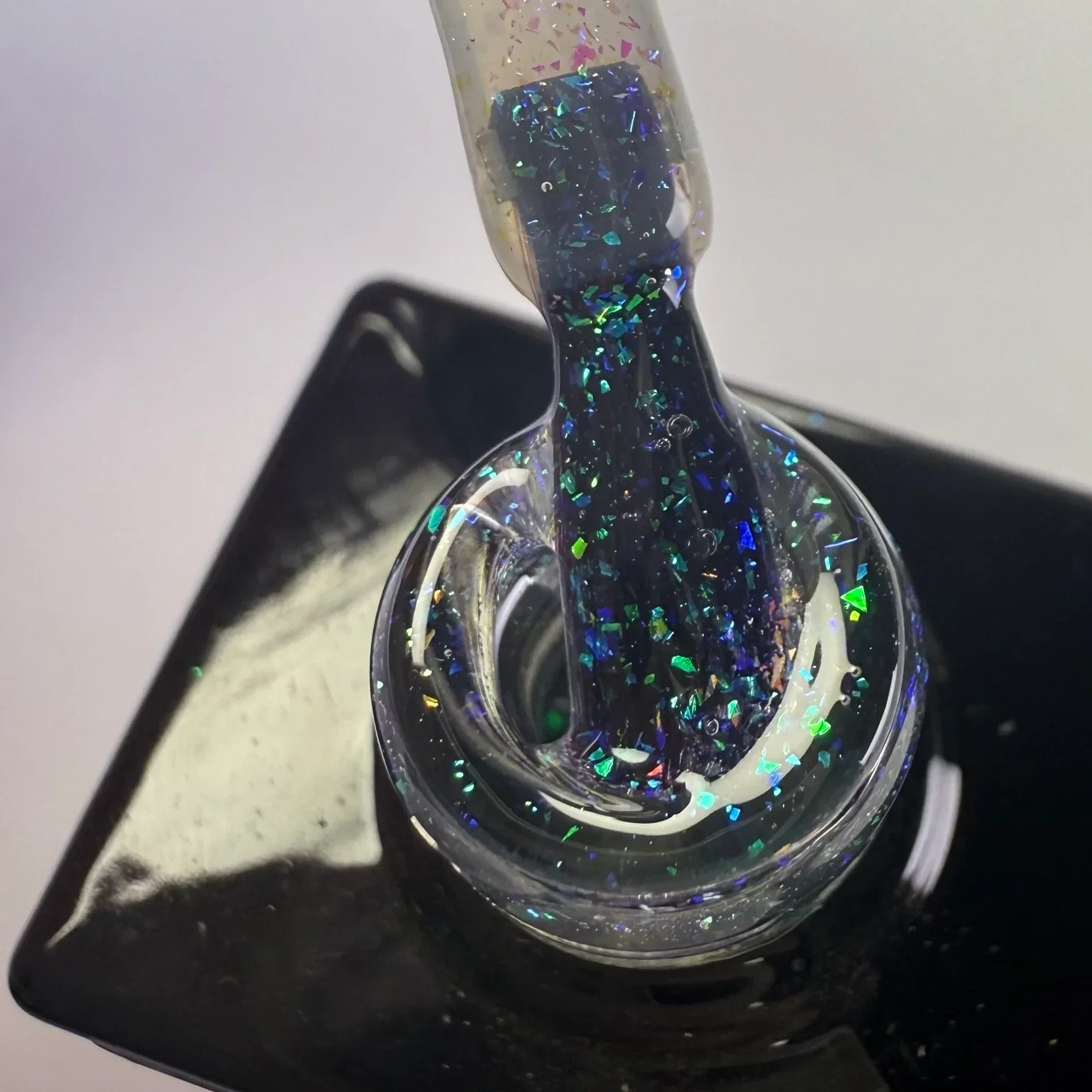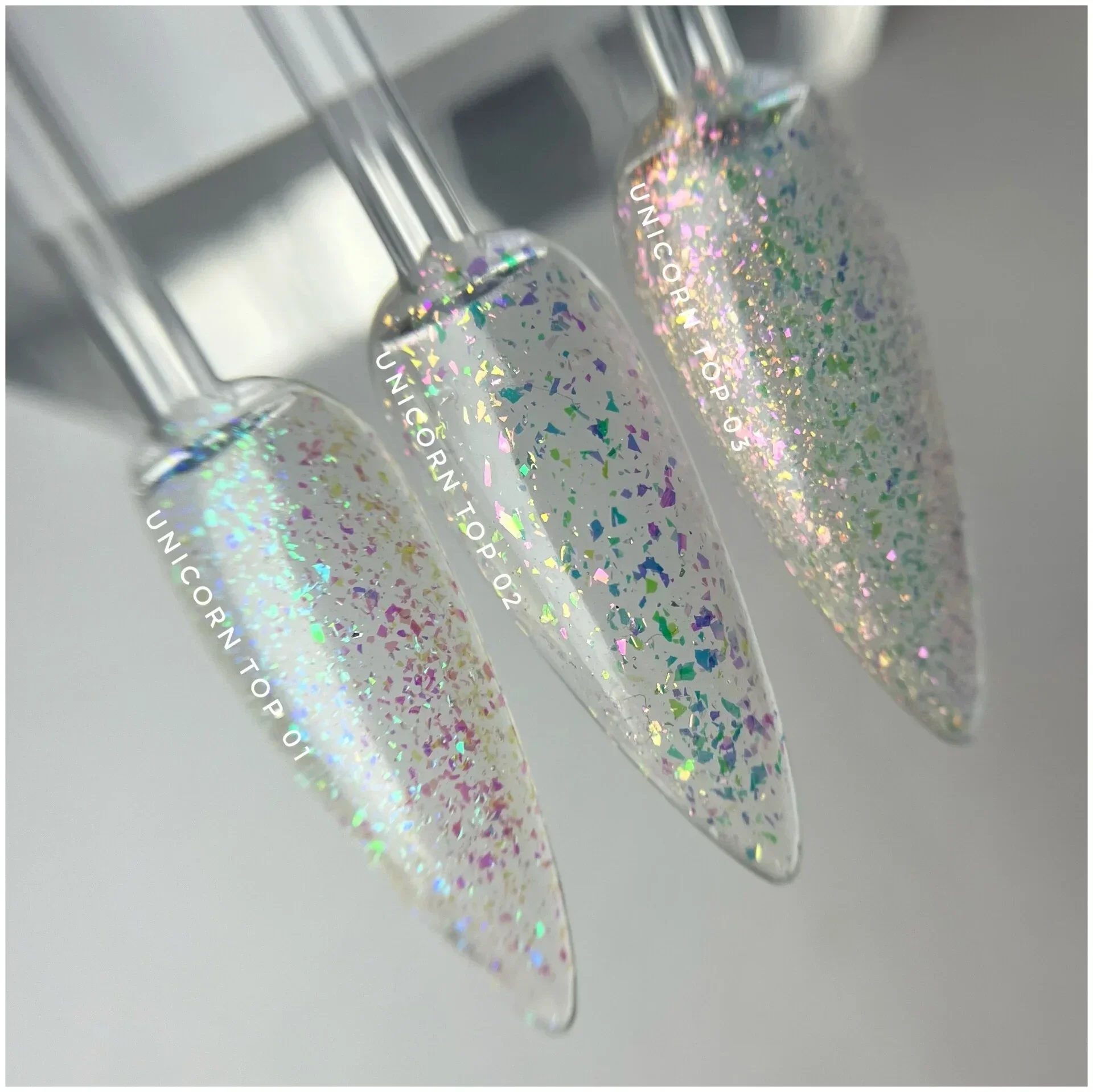 De unicorn top coat zorgt voor een magische finish dankzij de prachtige flakes die bij elke beweging van kleur veranderen. De flakes komen op iedere ondergrond anders tot hun recht, waardoor elke set nagels een uniek en speels effect krijgt. Perfect als top coat over elke kleur gel of gelpolish voor een opvallende, trendy look.