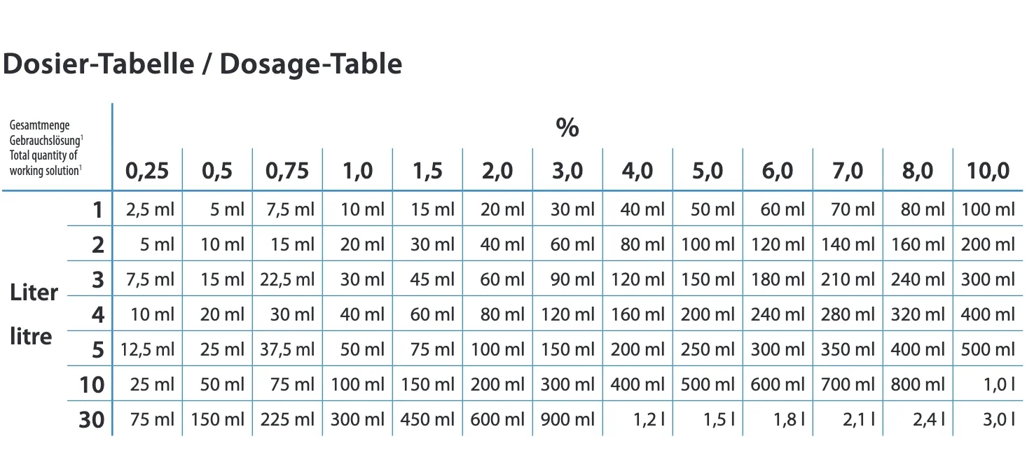 - Gebruiksconcentratie: 1% (10ml per 1000ml water) | 2% (20ml per 1000ml water)